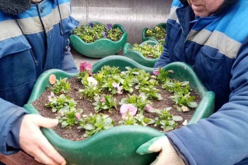 Работа идёт быстро и с настроением: видно, что люди делают это не формально, а с желанием преобразить пространство. А рядом уже красуется новая декоративная цветочница — небольшой, но заметный штрих, который делает место уютнее.