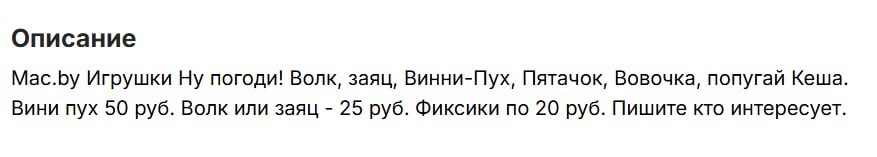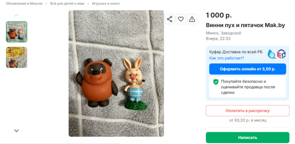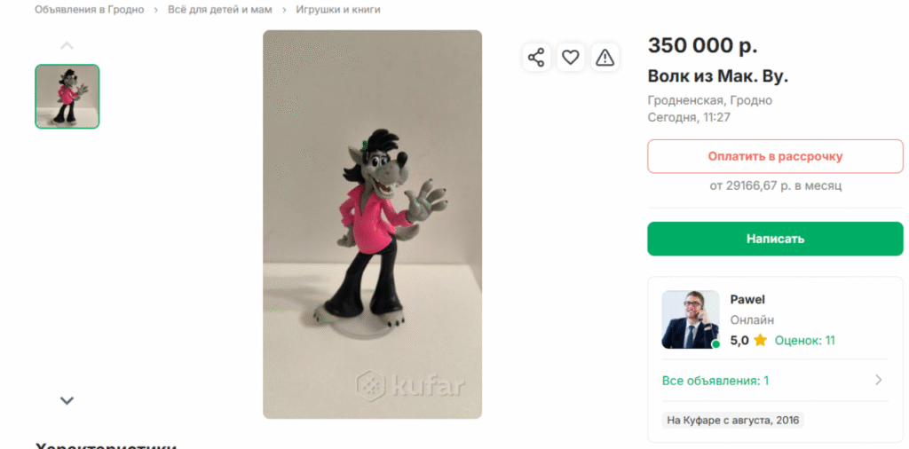 Другое, не менее креативное, предлагает Волка за 350 000 рублей. В описании продавец с юмором (или без?) сообщает, что фигурка — «самый первый волк из серии Мак.by. Имеет коллекционную ценность. Выставлялась в Лувре, Эрмитаже, Прадо и музее Ватикана» и готовится к аукциону в Нью-Йорке, но для особо заинтересованных лиц возможна продажа «мимо кассы».