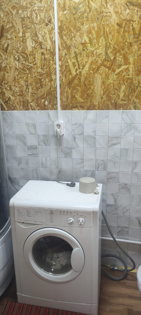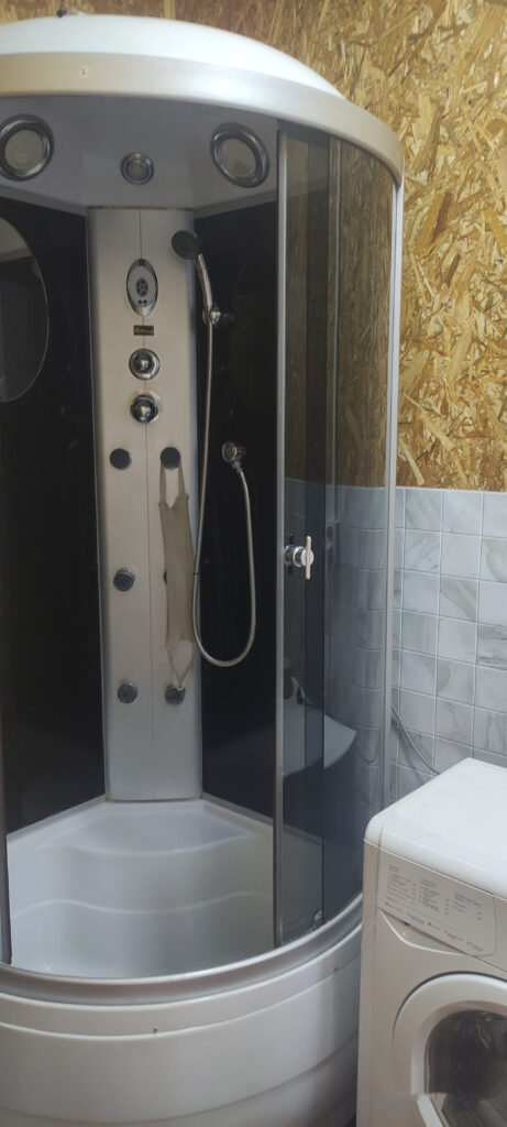 Санузел совмещенный с душевой кабиной и стиральной машиной.