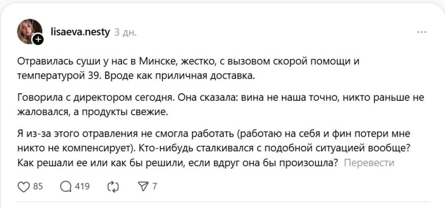 Несколько дней назад в соцсети Threads появился пост от минчанки, которая рассказала о тяжелом отравлении после заказа суши. По ее словам, состояние было настолько серьезным, что потребовался вызов скорой помощи.
