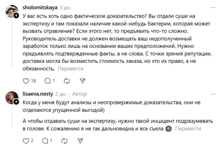 «У вас есть хоть одно фактическое доказательство? Вы отдали суши на экспертизу и там показали наличие какой-нибудь бактерии, которая может вызвать отравление? Если этого нет, то предъявить что-то сложно», — написал один из комментаторов.