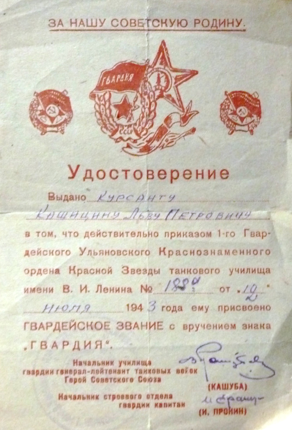 Отец Льва ушел на фронт в 1941-м, а в 1943-м от него перестали приходить письма, лишь позже выяснилось, что капитан Петр Кашицын погиб. И Лев, получив аттестат об окончании 10 класса, поехал в Ульяновское танковое училище вместе с пятью одноклассниками. Начальником училища был генерал Кашуба, потерявший в советско-финскую войну ногу, он-то и понял стремление 16-летнего Льва Кашицына отомстить за погибшего отца.