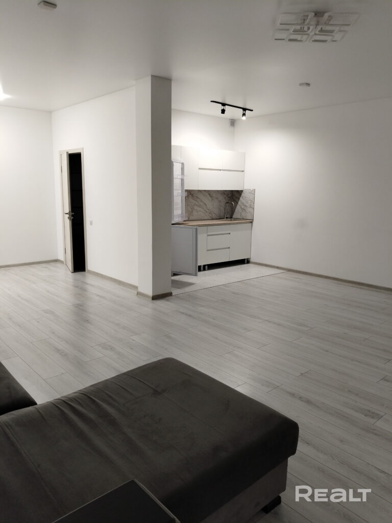 Несмотря на стоимость аренды, жилье довольно аскетичное. Жилая зона практически пустая, за исключением дивана и огороженного кухонного уголка.