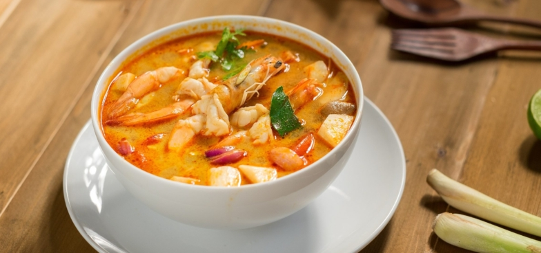 Этот знаменитый тайский суп сочетает в себе остроту, кислинку, пряную глубину и, конечно, насыщенный оранжево-красный оттенок.