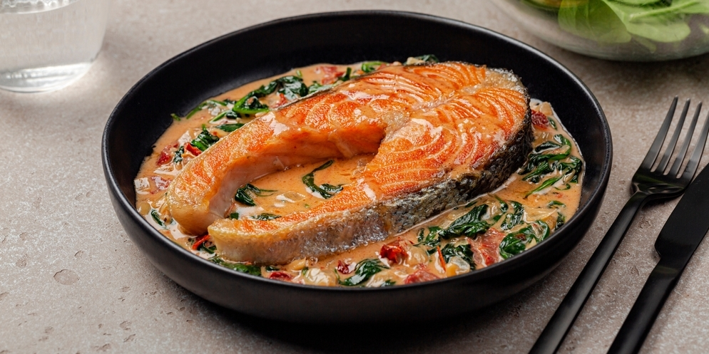 После пряного супа логичным продолжением станет более нежное, но не менее колоритное блюдо. Сочные стейки красной рыбы в сливочно-томатном соусе станут роскошным украшением трапезы.