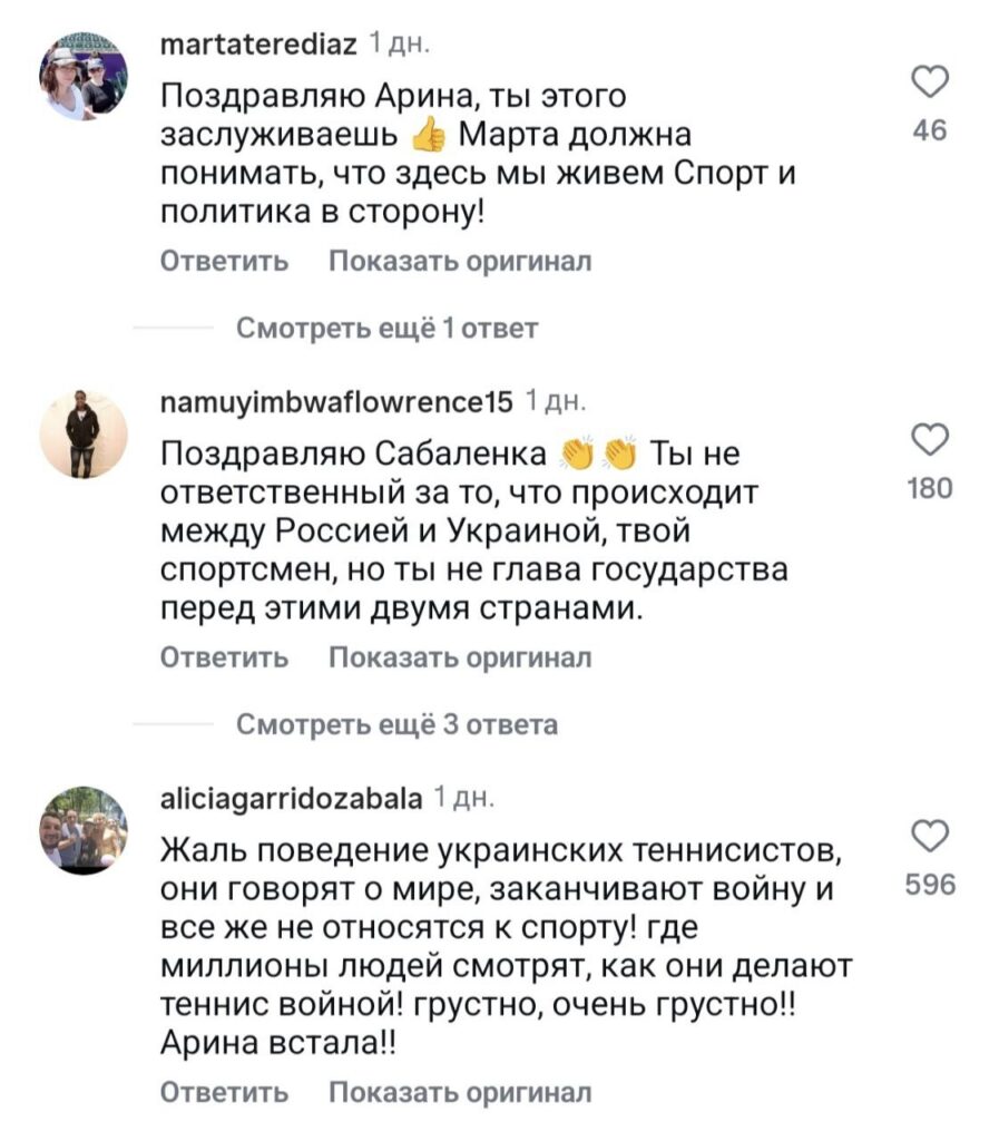 Но, увы, это не спасло. На украинку тут же набросились любители этого вида спорта, обвинив ее в хамстве и неуважении. «Жаль наблюдать за поведением украинских теннисистов. Они говорят о мире, но начинают войну в спорте. Очень грустно», — написал один из европейских пользователей. «Опять то же самое, какую ответственность несет Соболенко?», — встрял в разговор второй. Многих зацепил момент с сестрой, которая мерзнет в минус 20. Люди задались вопросом, почему Костюк, которая зарабатывает миллионы, не может перевести родственнице деньги или вывезти ту из зоны боевых действий. Вторая же половина пользователей бросилась поздравлять Арину с победой и благодарить за то адекватное поведение, которое она демонстрирует на корте.