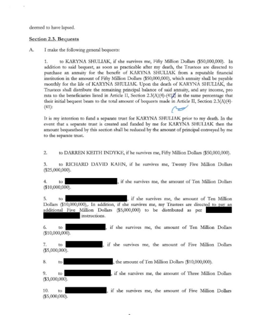 В трасте, составленном Эпштейном, Шуляк предписано было получить примерно 100 миллионов долларов, 48 бриллиантов, права на его дом в Палм-Бич (Флорида), квартиру в Париже площадью 700 кв. м и 7-этажный пентхаус в Нью-Йорке, ранчо «Зорро» в Нью-Мексико и даже частные острова в Карибском море, о которых писал весь мир.