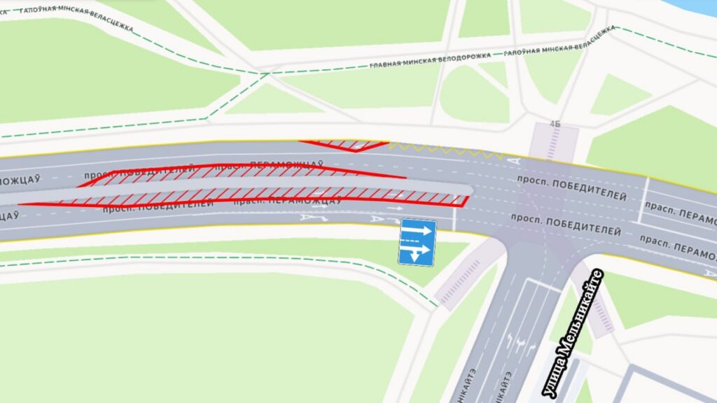 С 22:00 13 февраля на участке от улицы Мельникайте до проспекта Машерова количество полос для движения транспорта уменьшат с трёх до двух в каждом направлении.