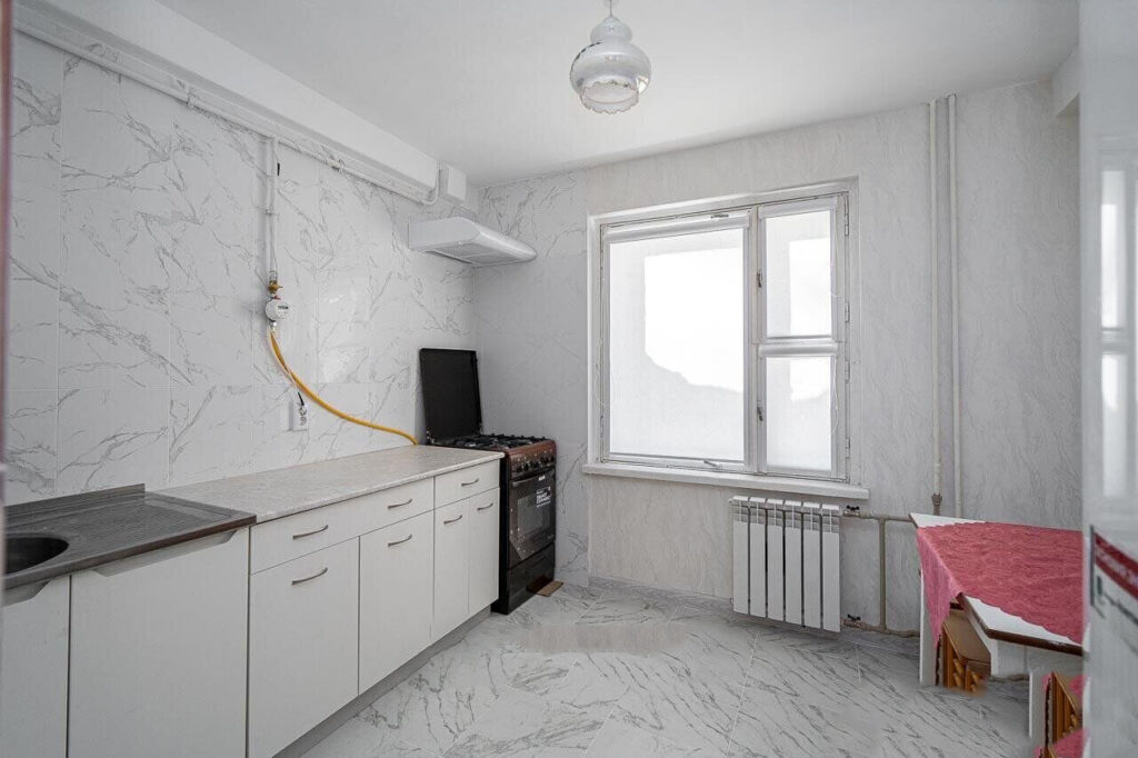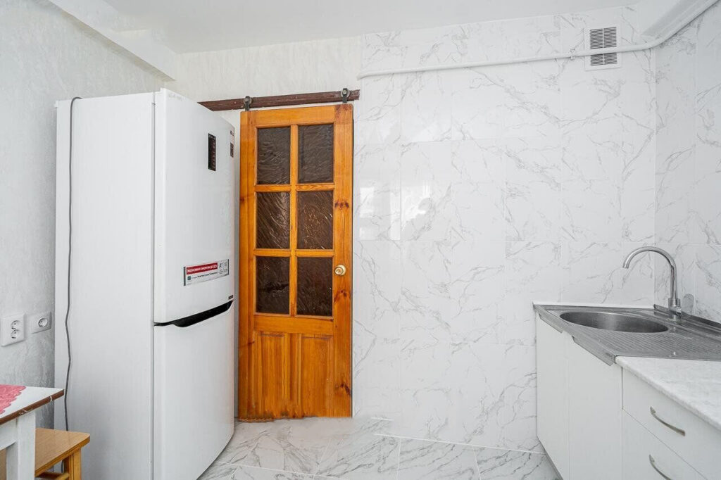 Кухня в жилье, несмотря на современную обстановку, выглядит немного отталкивающе за счет полуголых стен и практически сплошного белого цвета. Но это только первое впечатление — все необходимое, включая плиту, холодильник, вытяжку и стол со стульями для принятия пищи, в комнате есть.