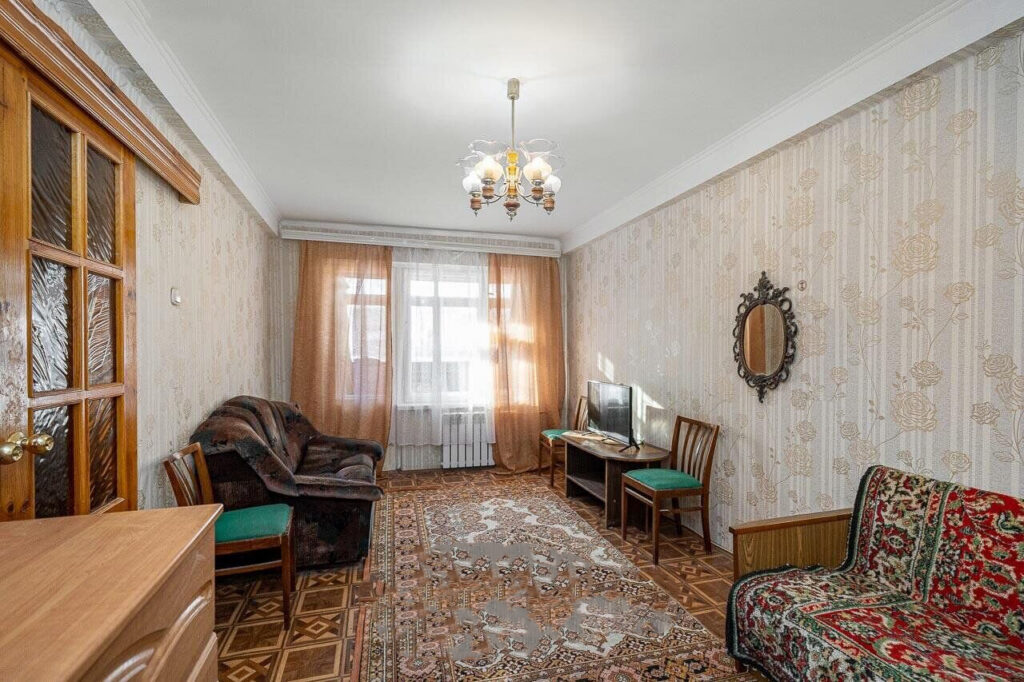Жилая комната выглядит более уютно и даже немного по-советски за счет ковров и деревянной мебели. Здесь расположены диван, кушетка, комод, шкаф и телевизор.