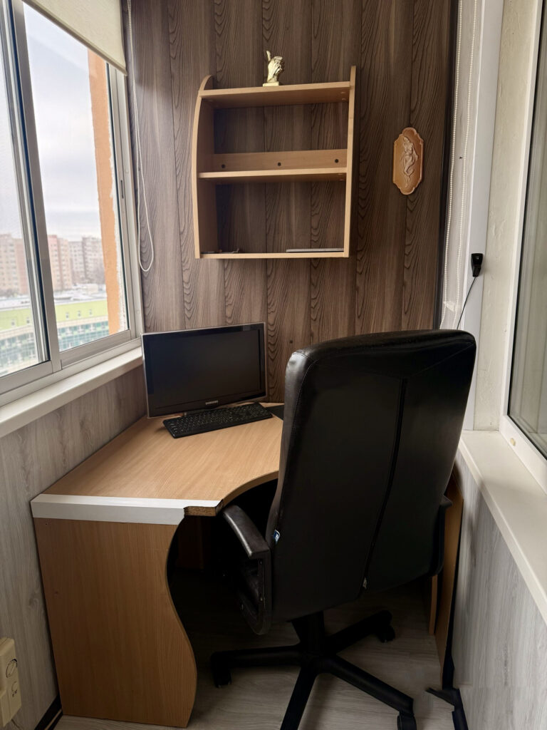 На балконе разместился небольшой рабочий кабинет. В правом углу размещен небольшой стол с персональным компьютером и большим кожаным креслом. В левом углу стоит кушетка на случай, если арендатор устанет в течении напряженного дня. Балкон надежно утеплен, поэтому в холодное время года квартиросъемщик не замерзнет.