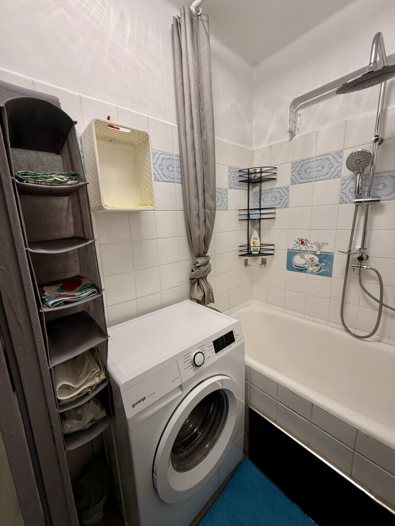 Санузел раздельный, в ванной комнате, помимо ванны, есть стиральная машина и тканевые кофры для полотенец.