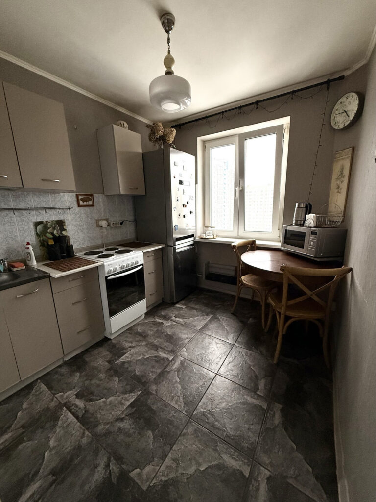 Кухня в квартире также небольшая, но вмещает в себя стандартный набор мебели и техники: шкафы, холодильник, плита, СВЧ-печь и столовый гарнитур.