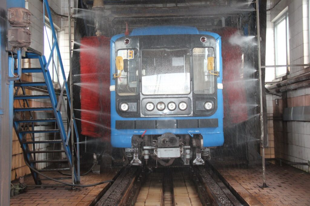 Поезда Минского метрополитена регулярно проходят обязательную очистку — как снаружи, так и внутри. Эта процедура проводится по графику и является частью стандартного технического обслуживания составов.