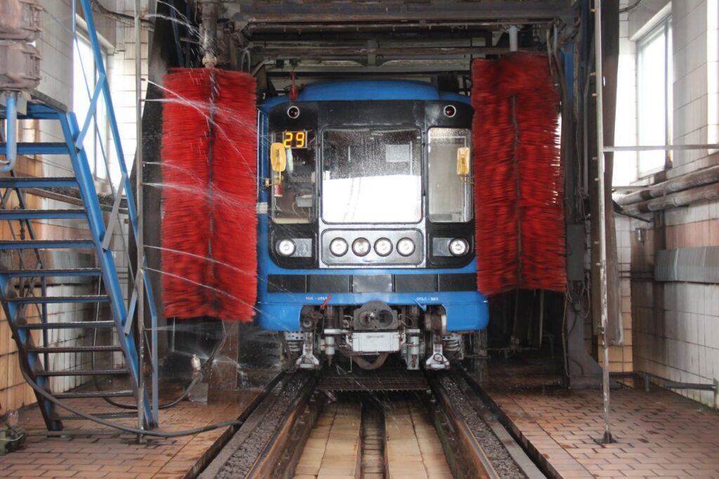 На территории электродепо оборудованы специальные моечные комплексы. Туда поезда заезжают, чтобы пройти полноценную «водную процедуру»: внешняя автоматическая мойка работает по принципу автомойки, но рассчитана на длину всего состава. Параллельно проводится уборка салонов.