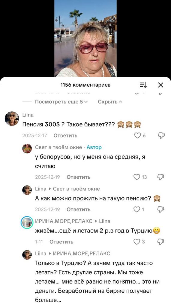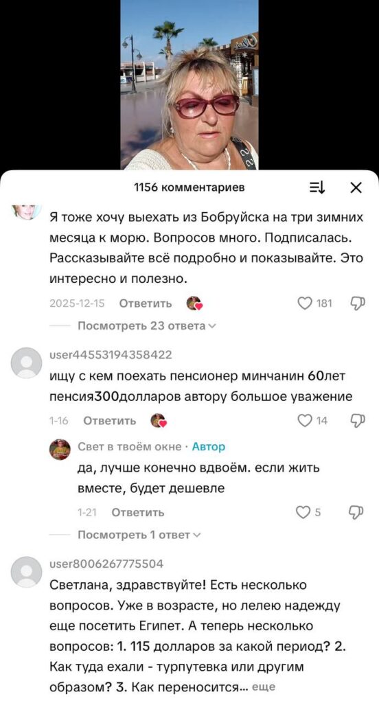 65-летняя пенсионерка из Минска нашла способ провести три зимних месяца на берегу Красного моря в египетском городе Хургада на свою белорусскую пенсию (около 300 долларов). Своим опытом она делится в TikTok, где у нее уже более 7 тысяч подписчиков. Её блог стал настоящей инструкцией для тех, кто мечтает о солнце и море, но опасается финансовых затрат.