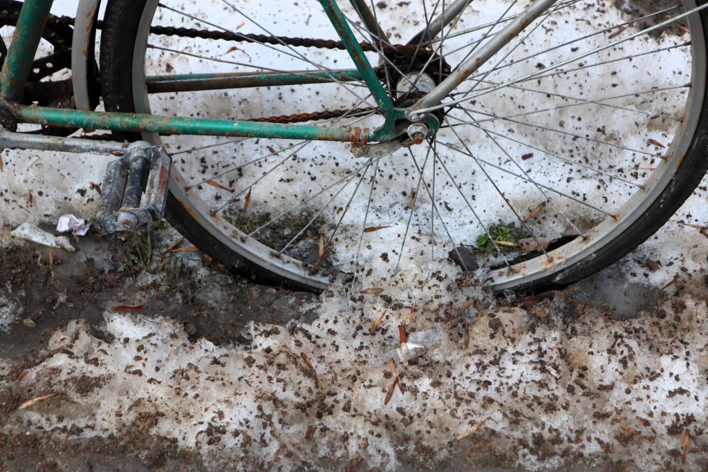 Остаётся загадкой, кто и когда закрывал прошлый велосезон и откроет ли его в наступившем году на ещё одном велосипеде отечественного производства, который припаркован на Великом Гостинце возле супермаркета «Санта».