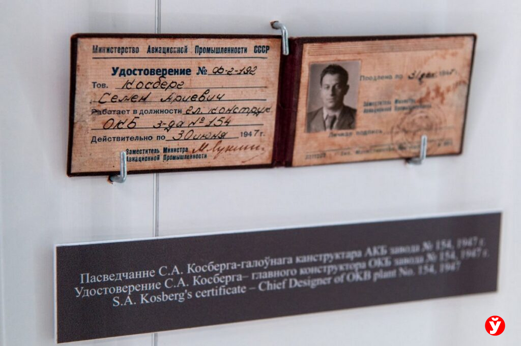В музее хранится личное дело Косберга, переданное его сыном, — анкета, автобиография, фотографии. На одном из снимков — семья Арона Косберга в Слуцке (1932 год), где Семён запечатлён вместе с женой, тоже уроженкой Слуцка. Кстати, сам конструктор был заядлым рыбаком, своими руками строил лодки, шил одежду. Его именем названы улицы в Слуцке и Воронеже, где он долгие годы возглавлял завод химической автоматики.