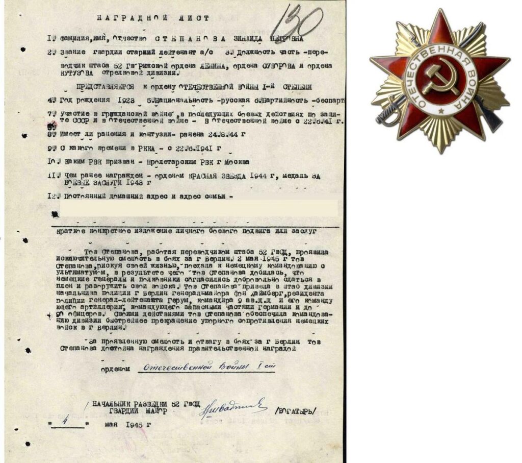 Но оказалось, что Великая Отечественная война закончилась, но не закончилась служба переводчицы, и… разведчицы Зинаиды Степановой. Об этом говорит тот факт, что в хранилищах Центрального архива Министерства Обороны Российской Федерации обнаружен наградной лист на Зинаиду Петровну Степанову, составленный штабом 3-й ударной армии Группы советских оккупационных войск в Германии. И ее представляли к ордену Красного Знамени.