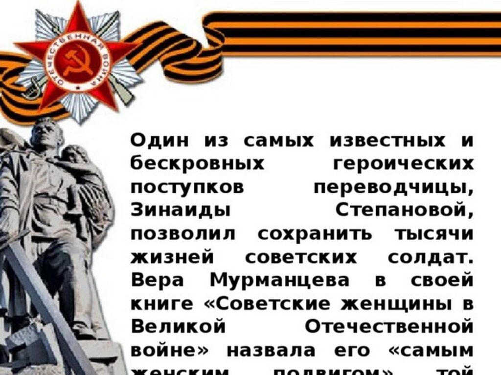 Сегодняшнее повествование посвящено одной из них: москвичке Зинаиде Степановой, студентке института иностранных языков, она дошла до Берлина, будучи переводчицей разведывательного отдела 52-й гвардейской Рижской стрелковой дивизии. Но ее боевой путь отмечен не только умением «вытащить» из захваченных «языков» важную информацию, но и мужеством на поле боя. А «главный женский подвиг», как назвала поступок Зинаиды Степановой писательница Вера Мурманцева, она совершила в Берлине, в самом конце Великой Отечественной войны.