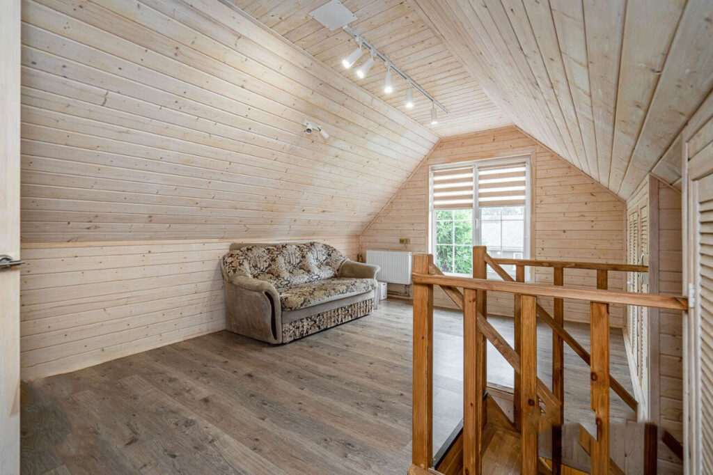 Двухэтажный дом, который был построен и введен в эксплуатацию в 2022 году, имеет интересную и современную форму. Стены коттеджа отделаны деревом, а крыша покрыта ондулином. Общая площадь дачи составляет 140 квадратных метров. Внутреннее пространство включает в себя просторную кухню-гостиную и несколько жилых комнат, которые уже обставлены мебелью и декорированы.