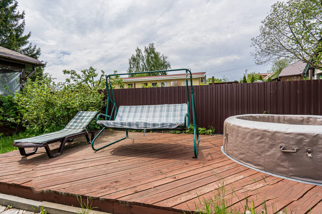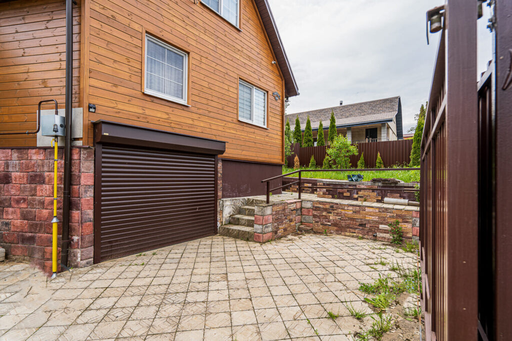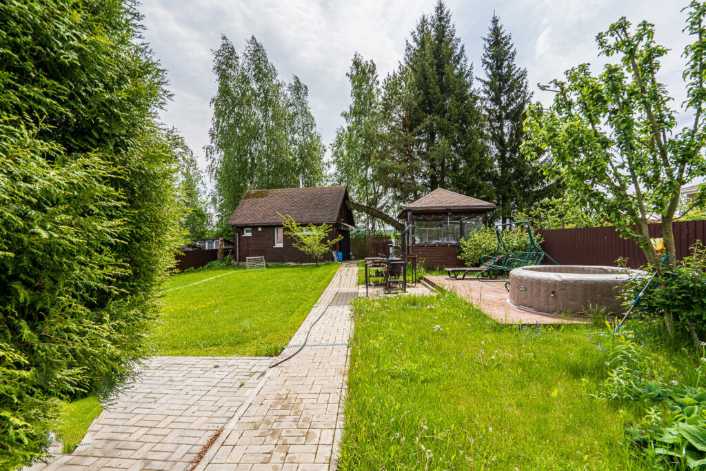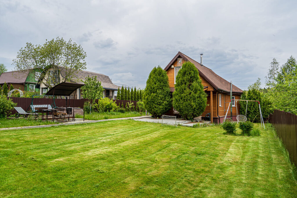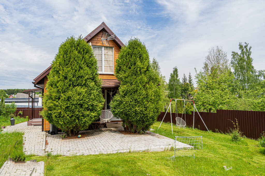 С мансардного этажа открывается великолепный вид на участок, который занимает 7 соток. На территории имеется не только баня с купелью, но и зона для барбекю с беседкой, небольшое футбольное поле и парковка для автомобиля. Участок оформлен с учетом ландшафтного дизайна: земля покрыта газонной травой, а по периметру высажены высокие туи, создающие живописный зеленый забор. Также предусмотрены аккуратные дорожки из тротуарной плитки, которые делают передвижение по участку удобным. Высокий забор из металлопрофиля обеспечивает приватность и безопасность, а автоматические откатные ворота на пульте управления добавляют комфорта в повседневную жизнь.