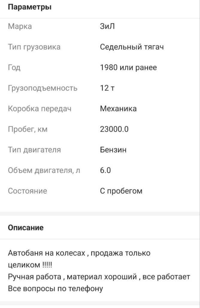 На просторах Куфара нашлось интересное предложение. Некто в Барановичах готов продать баню на колесах. Она построена на базе ЗиЛ 1980-го года. Грузоподъемность — 12 тонн, коробка передач — механика. Имеется и пробег — 23000.0 км, а также описание от продавца. Он заявляет, что это ручная работа, сделано из хорошего материала и все работает, продажа осуществляется только целиком. Стоимость составляет $8 000 или 23 845 белорусских рублей. Кстати, за новую баню-бочку нужно отдать от 11 000 белорусских. Больше подобных предложений на просторах Куфара не нашлось.