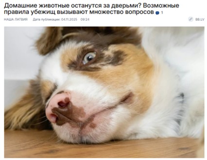 Латвийский портал bb.lv сообщает о буре общественных эмоций вокруг вопроса: возьмут ли кошек и собак в бомбоубежища? Можно ли эвакуироваться вместе с домашними питомцами? Что делать с хомяками?