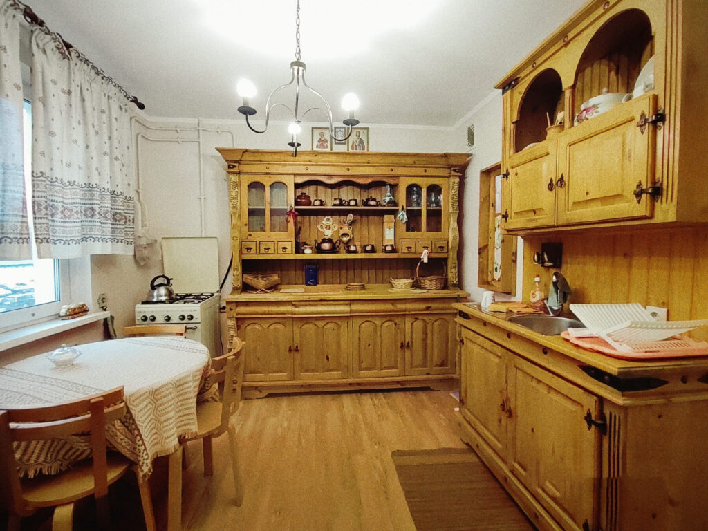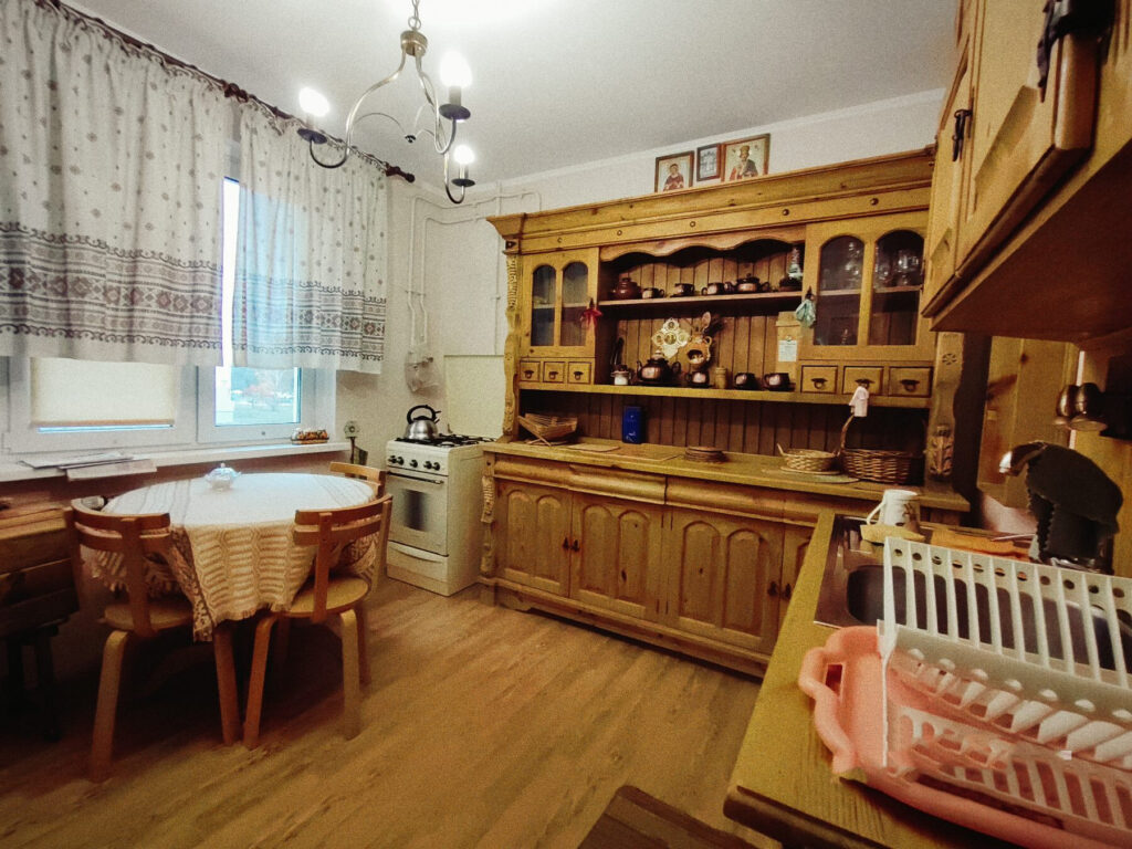 В большой жилой комнате есть диван, телевизор, рабочая зона с компьютером и столом, отделенная небольшим шкафом, а также двухспальная кровать. В спальне кроме большой кровати есть одежный шкаф и комод. В кухне, кроме стандартного набора бытовой техники (холодильник, плита, СВЧ-печь), имеется настоящая изюминка — резной деревянный мебельный гарнитур в старорусском стиле, состоящий из большого серванта и нескольких шкафчиков.