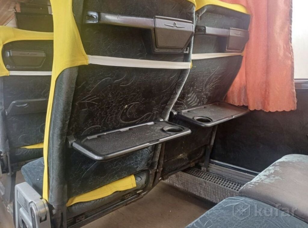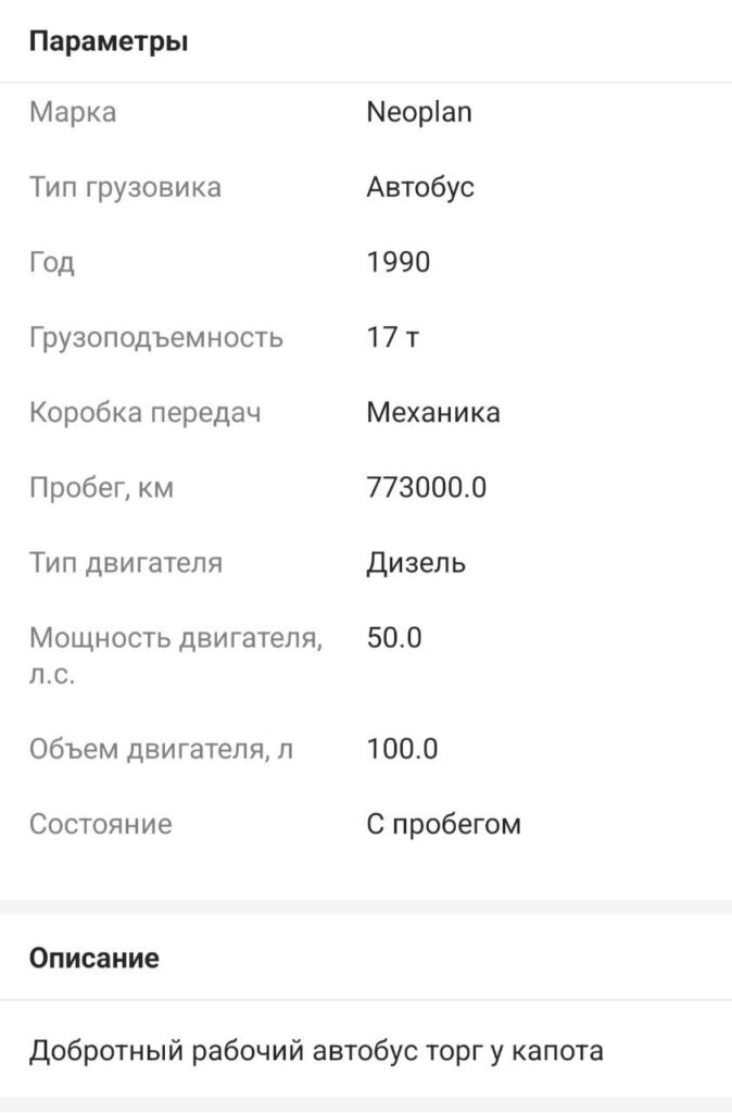 Производители заверяют, что в зависимости от модификации, автобус может вмещать от 44 до 63 человек. Внутри — мягкие кресла с откидными спинками, индивидуальные системы вентиляции и освещения, кондиционер, туалет, мультимедийные экраны и вместительные багажные отсеки. Есть ли все это в нашем лоте, не понятно. Продавец указывает только год выпуска — 1990-й, грузоподъемность — 17 тонн, внушительный пробег — 773000.0, а также мощность двигателя в 50.0 лошадиных сил.