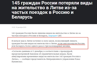 В начале декабря 2024 года литовский Департамент миграции отчитался: с мая ведомство аннулировало разрешения на временное проживание у 145 граждан России. Основание — нарушение Закона об ограничительных мерах, продлённого до 2 мая 2026 года.