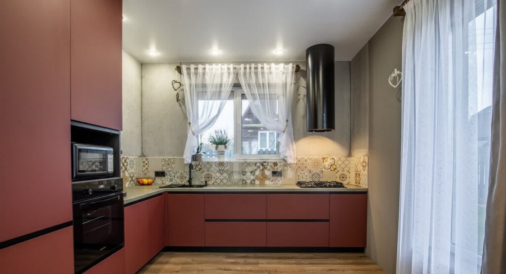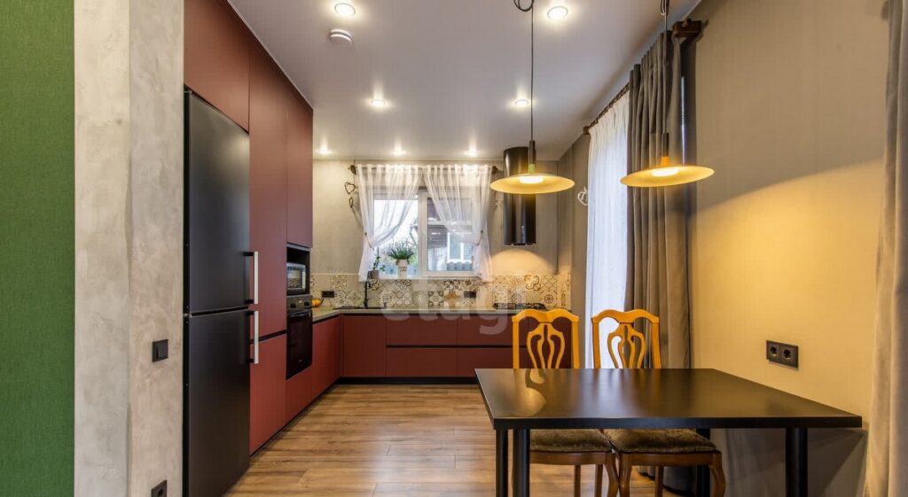 Встроенная кухня укомплектована всей необходимой техникой. Вся дизайнерская мебель, которая создает уникальную атмосферу в доме, также остается в нем.