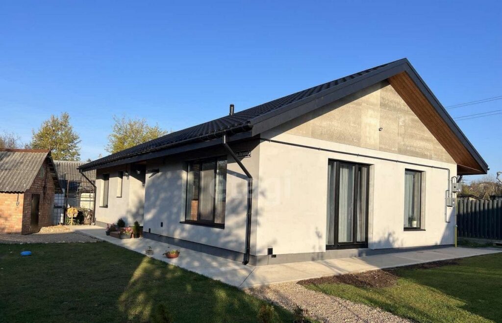 Дом находится в СТ «Текстильщик-1», расположенном по Мядельскому направлению. Он был сдан в эксплуатацию осенью 2025 года и построен с использованием газосиликатных блоков толщиной 300 мм. Дополнительно дом утеплен 100 мм слоем пенопласта и отделан декоративной штукатуркой. В качестве основания используется прочная монолитная плита. Крыша дома выполнена в виде простого двускатного покрытия и накрыта модульной металлочерепицей.