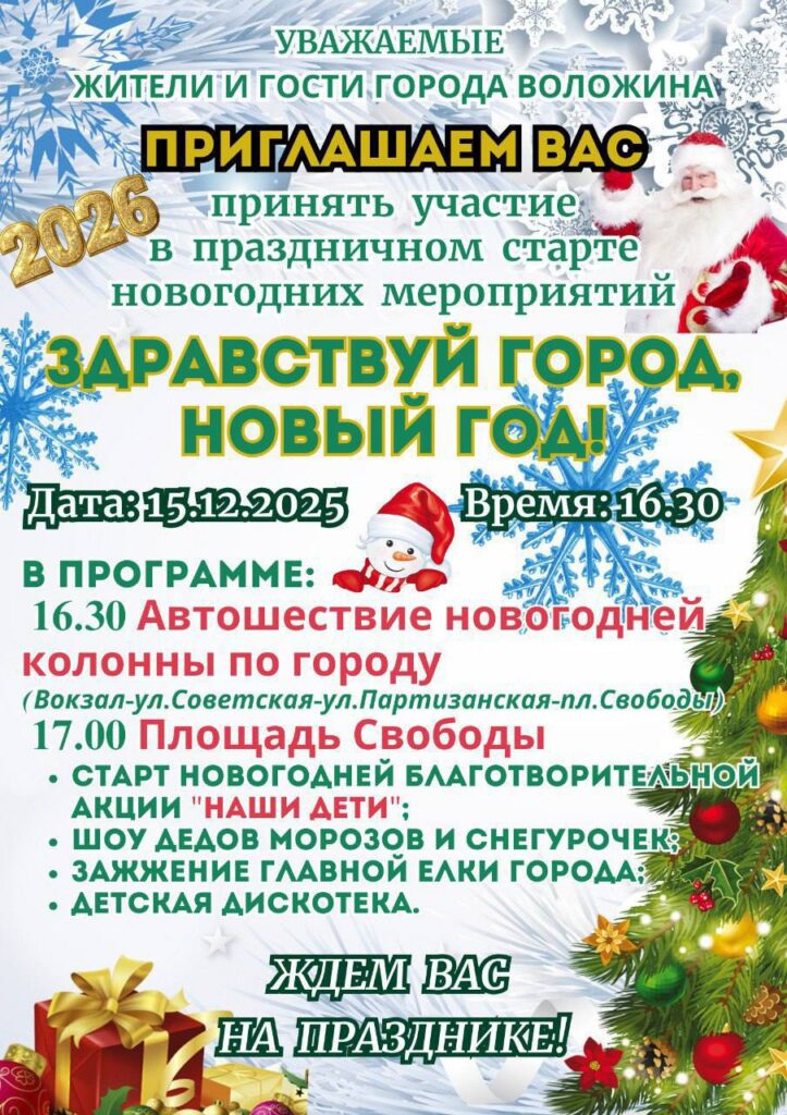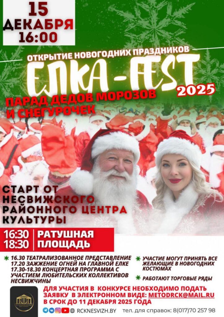 В Несвиже 15 декабря в 16:00 — «ЁЛКА-FEST 2025» и парад Дедов Морозов на Ратушной площади. В Клецке 24 декабря — новогоднее представление «Вася Мороз в ожидании чуда» с атмосферой сказки и встречей с Дедом Морозом.