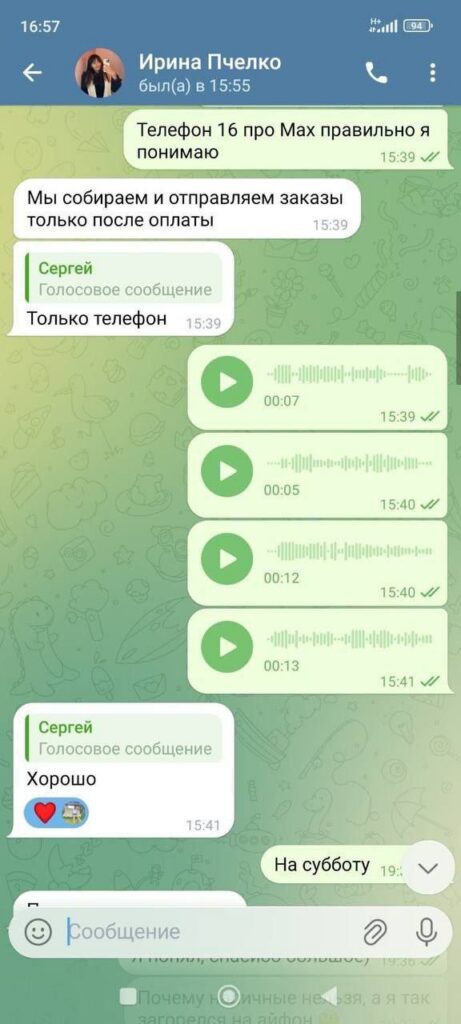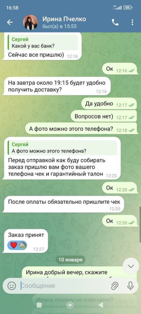 Ловушка захлопнулась быстро. Сначала покупатель хотел модель попроще, но «Ирина» убедила брать флагман. Условие — только полная предоплата на карту. Никаких платежей при доставке товара. Деньги ушли на счет, и «Пчелка» сообщила, что заказ принят, покупку доставят вечером 10 января.