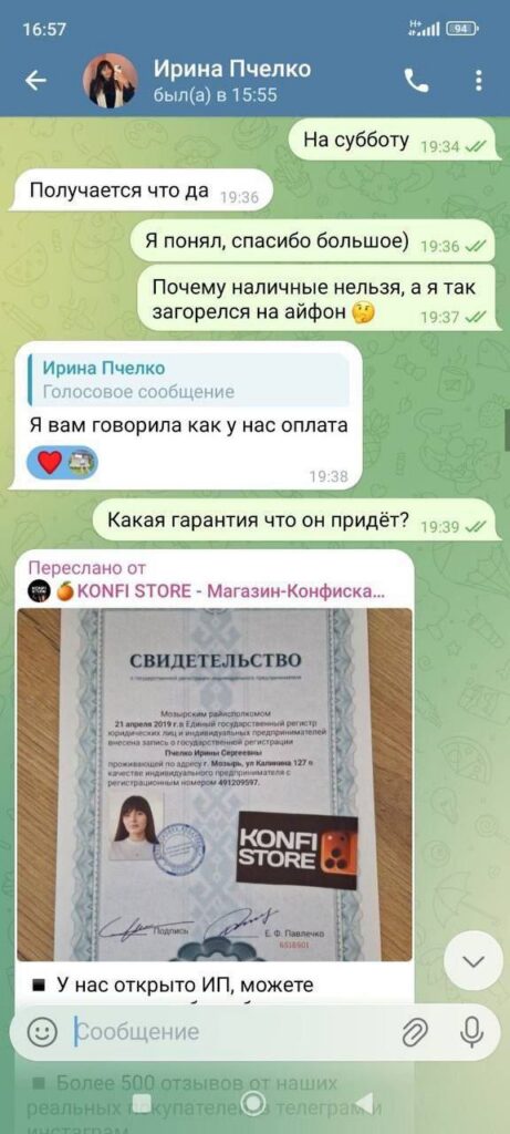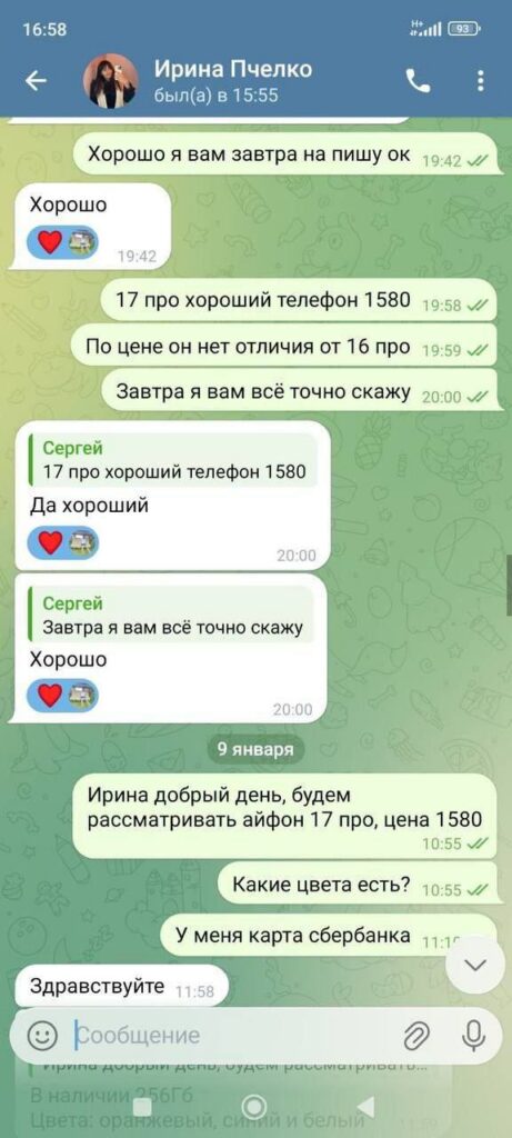 А ведь все было, как говориться, по классике жанра о мошенниках: красивая картинка в Instagram, магазин «конфиската» и очень сладкие цены. Новенький iPhone 17 Pro предлагали всего за 1580 рублей. Продавцом выступала некая «Ирина Пчелка», общение с которой шло уже в телеграмме.