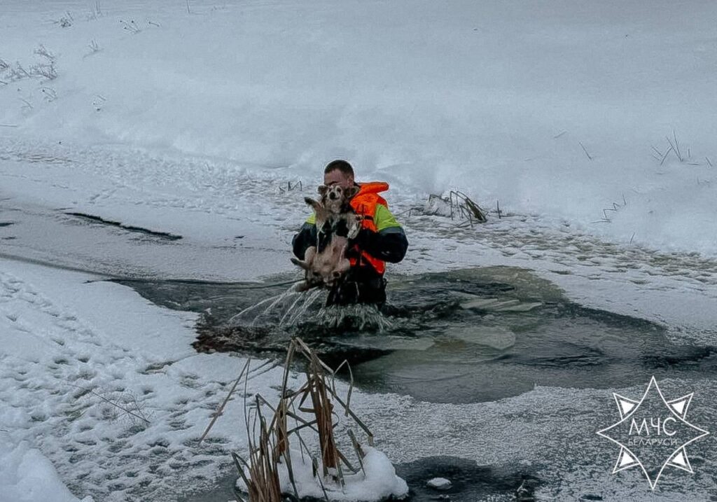 В Старых Дорогах спасатели вытащили провалившуюся под лед собаку