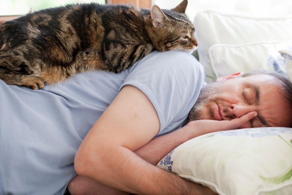 Кошки нередко спят беспокойно: могут часто просыпаться, двигаться или издавать звуки. Некоторые любят устраиваться прямо на голове или лице хозяина, что тоже не всегда способствует полноценному отдыху.