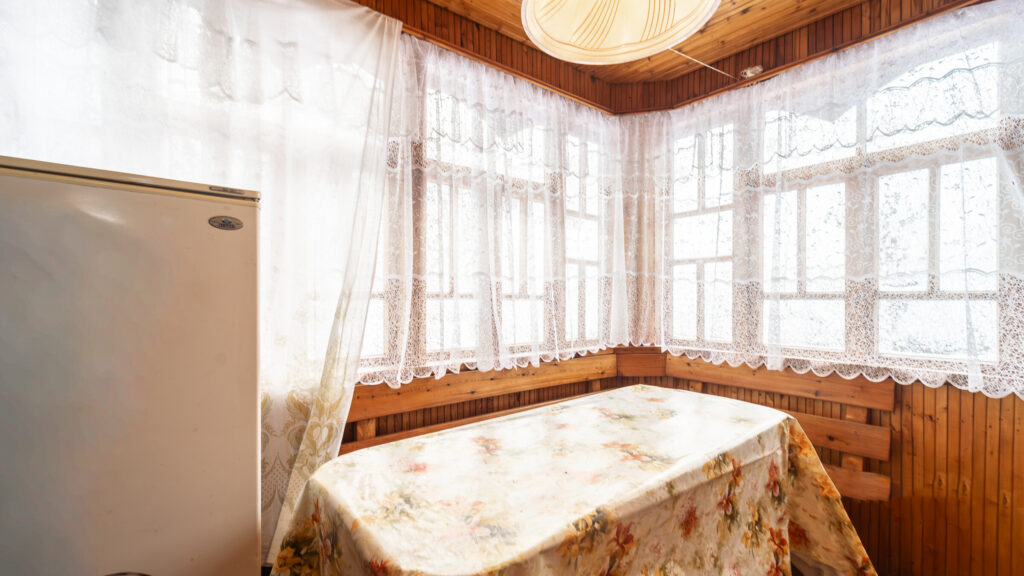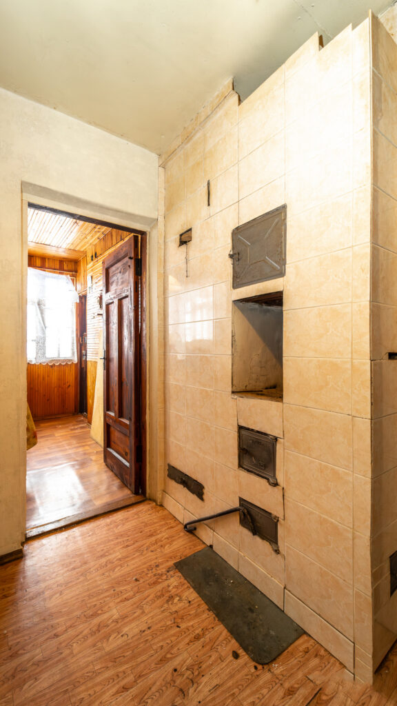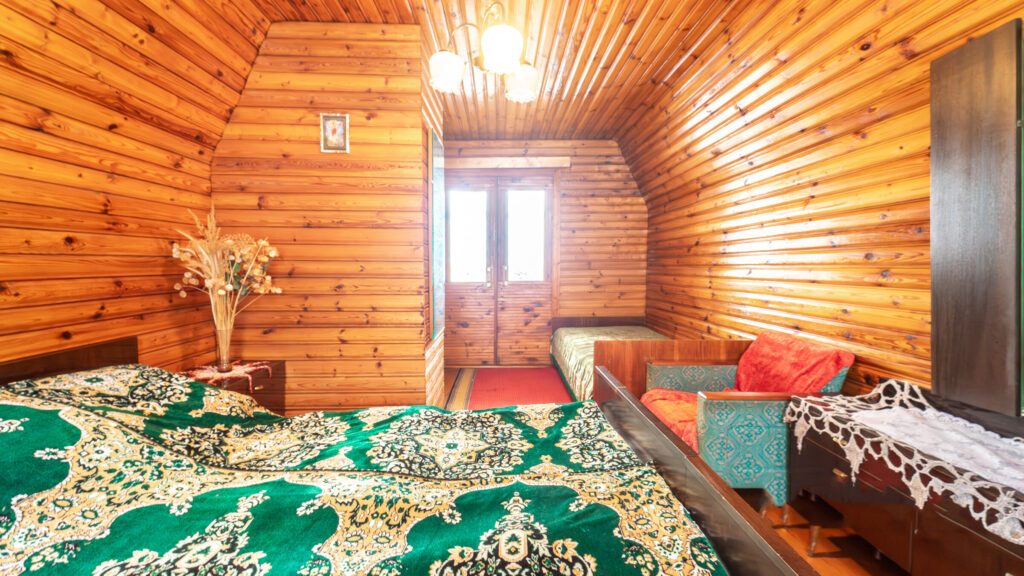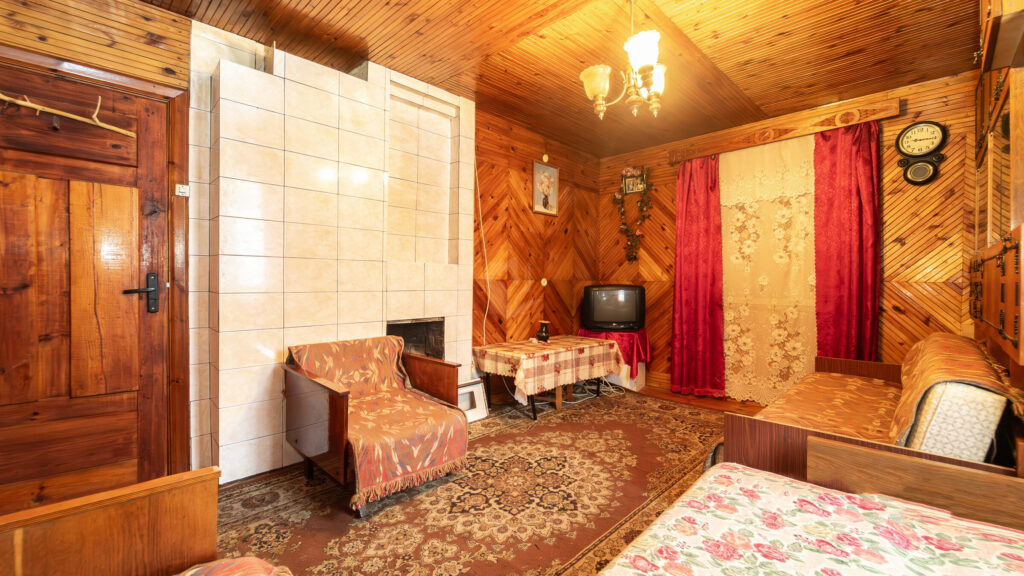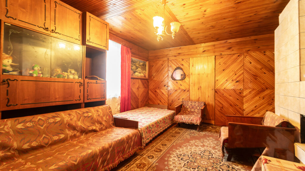 На первом жилом этаже расположены веранда, кухня и уютная жилая комната. Кухня оборудована надежной печью. В жилой комнате есть камин, который добавляет уюта и тепла, особенно в зимние вечера. Любители ретро-стиля оценят отделку помещений, выполненную с использованием вагонки, украшенной причудливыми узорами, а также шторы, ковры и теплое освещение, создающее атмосферу домашнего уюта.