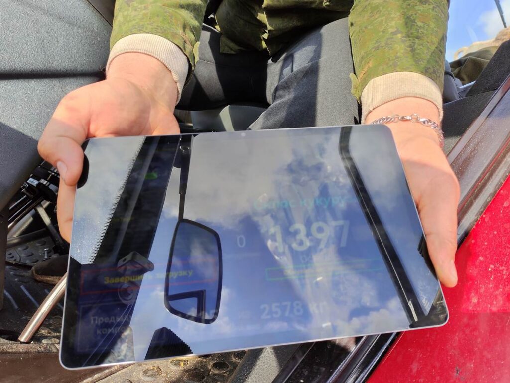 Пока мы беседуем с Любовью, к кормовому столу плавно подкатывает новенький сверкающий трактор «Беларус». За рулем – молодой специалист Александр Романенко. В кабине у начался механизатора – не только рычаги, оборудование для управления машиной, но и современный планшет.