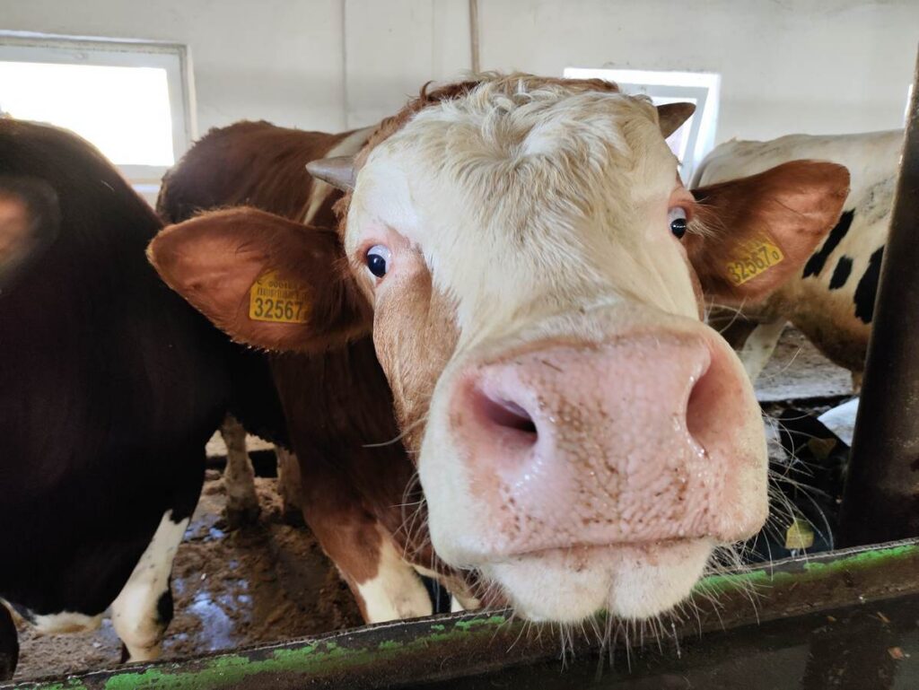 На фермах хозяйства сегодня можно увидеть пестрый состав. Здесь работают сразу с тремя породами: голштинской, красной датской и симментальской. Каждая имеет свои особенности, но настоящий фурор в 2025 году про извели именно симменталы.