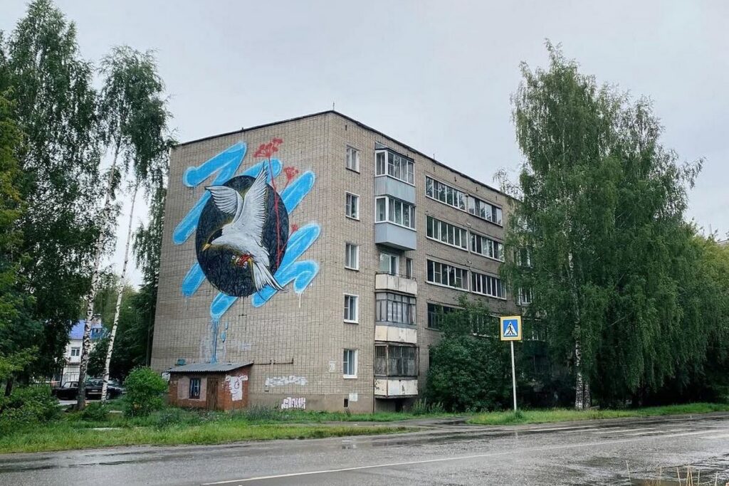 — Да. Я когда еще в школе учился, мечтал рисовать на фасадах. Всегда хотелось попробовать сделать что-то по своему макету. Такое у меня получилось в России, в Глазове. Нужно было раскрыть тему «Наследие Удмуртии», и я нарисовал птицу из Красной книги с какими-то графическими элементами. В лапах она держала баллончик с краской. Этот мурал я сделал за полтора дня. Организаторы очень удивились. Говорят, у нас ребята 10 дней рисуют фасад, а ты тут за полтора дня сделал? А я такой: белорусское мастерство все-таки!