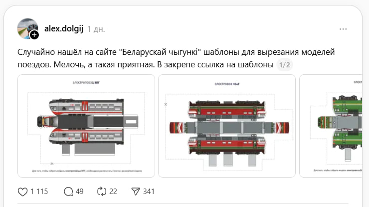 «Случайно нашёл на сайте «Беларускай чыгункі» шаблоны для вырезания моделей поездов. Мелочь, а такая приятная», — поделился открытием автор поста.