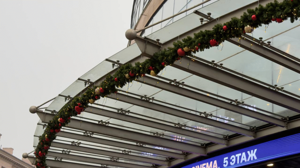 Вход здания украшен праздничной мишурой с игрушками и несколькими елками с гирляндой.