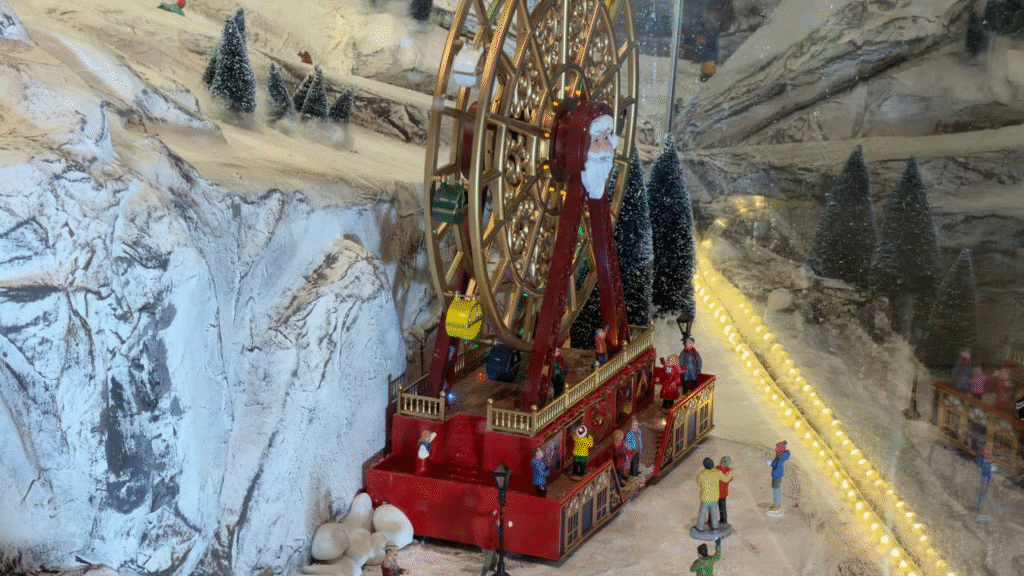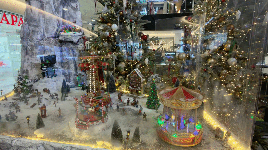 Здесь можно рассмотреть сцены новогодней карусели, горного фуникулера, каток — одним словом деревню в канун Рождества. Деревня поменьше расположилась на 2 этаже торгового центра прямо около эскалаторов.