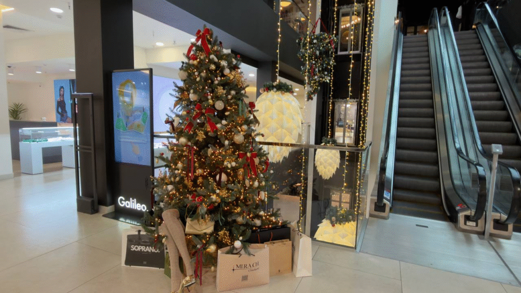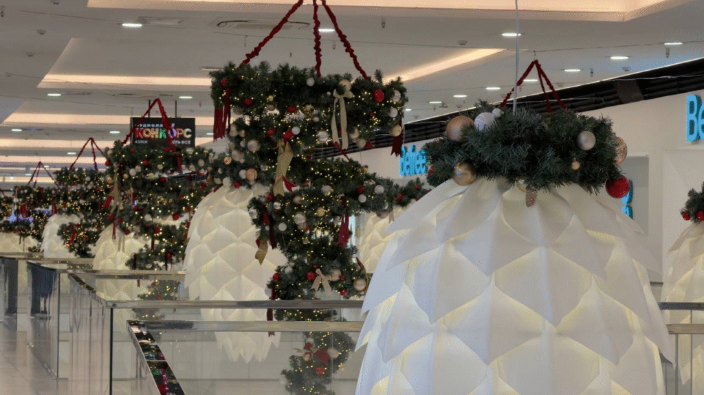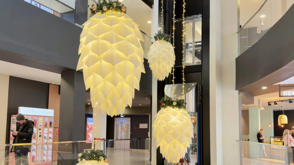 Пространство всего торгового центра заполнили пушистые ели и гигантские сверкающие шишки, которые свисают с потолка.