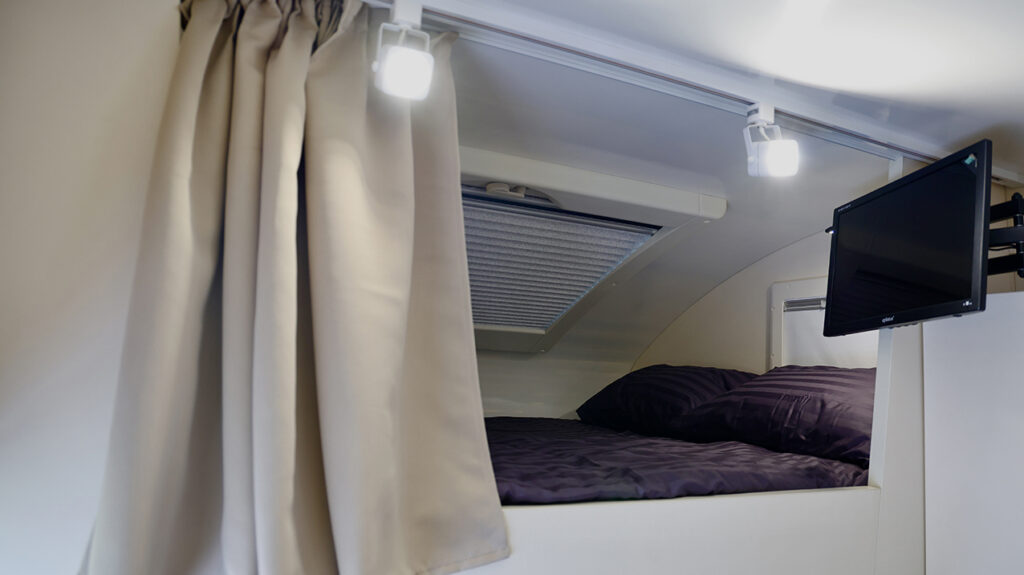 Интерьер автодома организован по принципу компактной квартиры. Внутри предусмотрены две отдельные спальные зоны, рассчитанные на размещение четырёх человек.