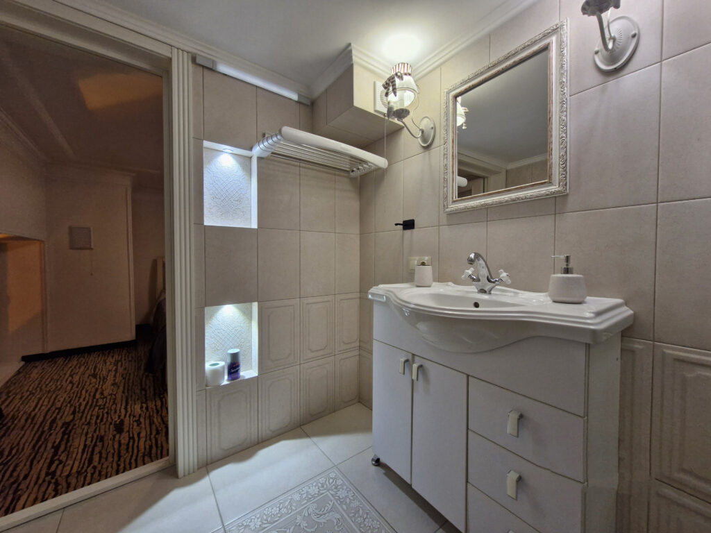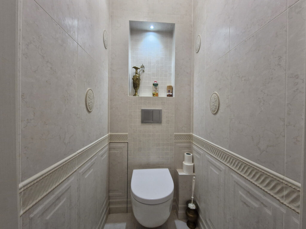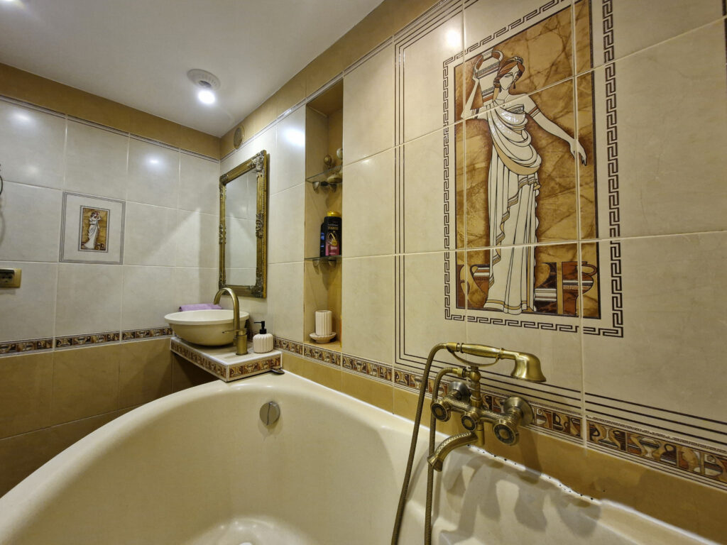 В жилье два санузла на каждом этаже. В первом находится ванна, во втором — душевая кабина.