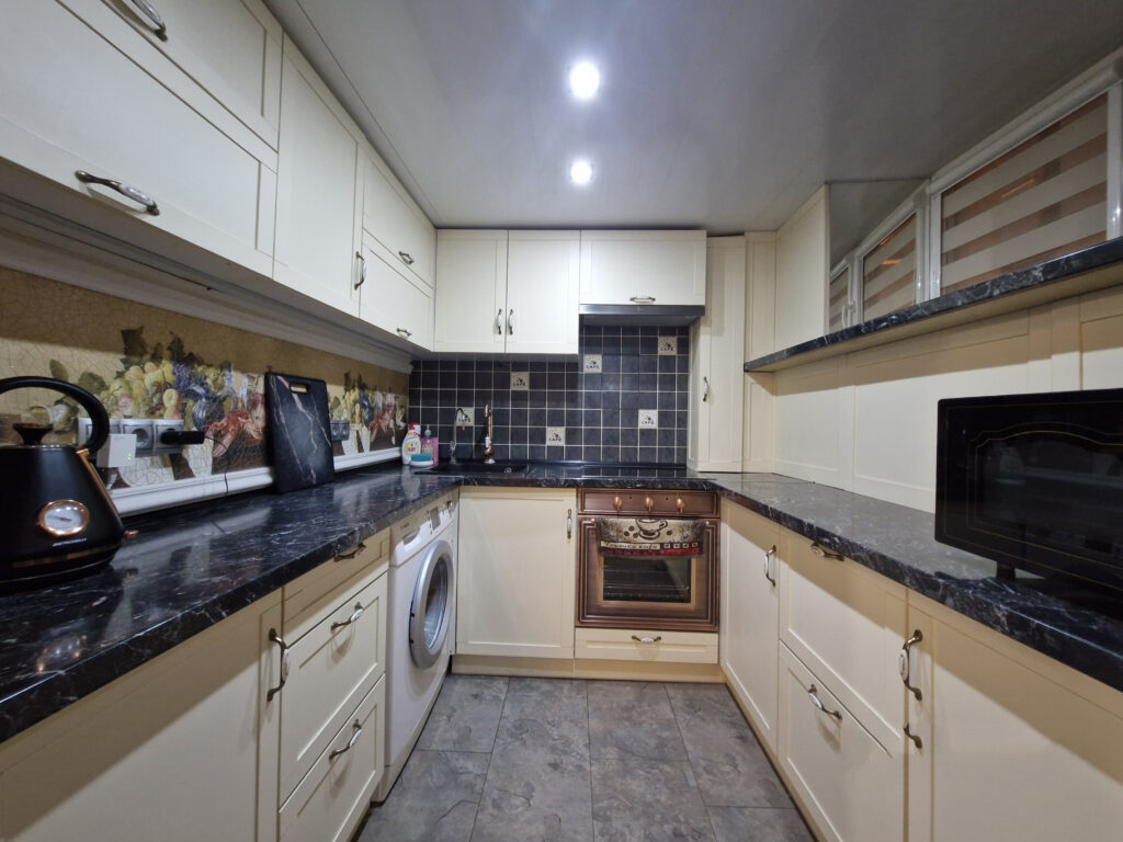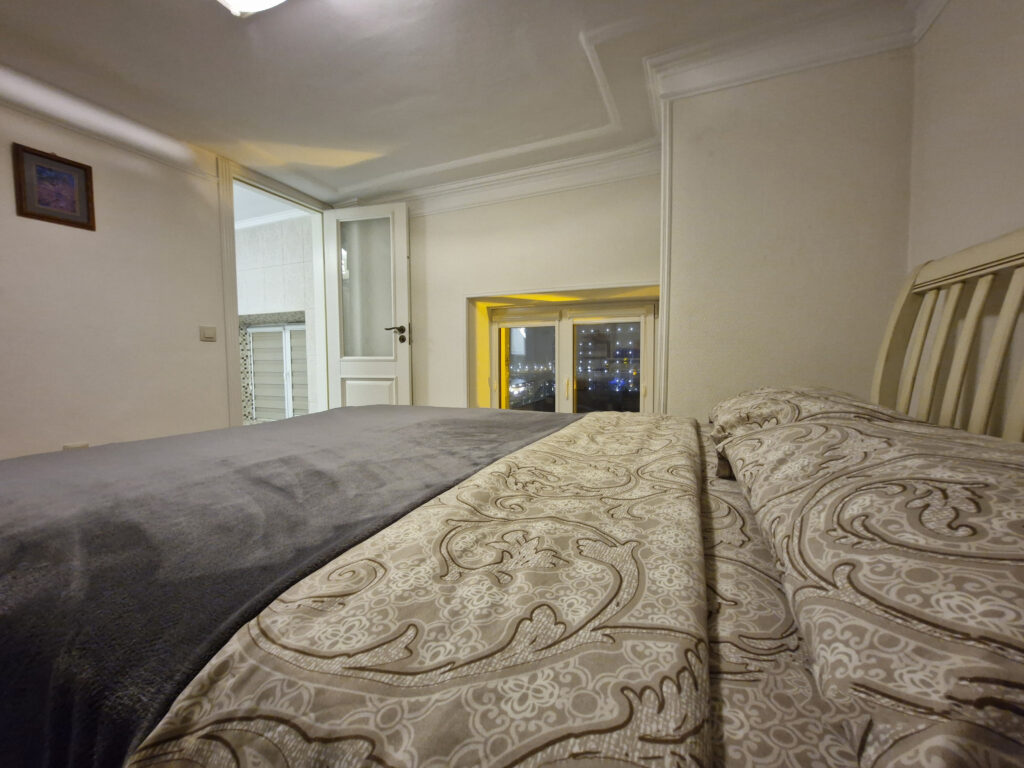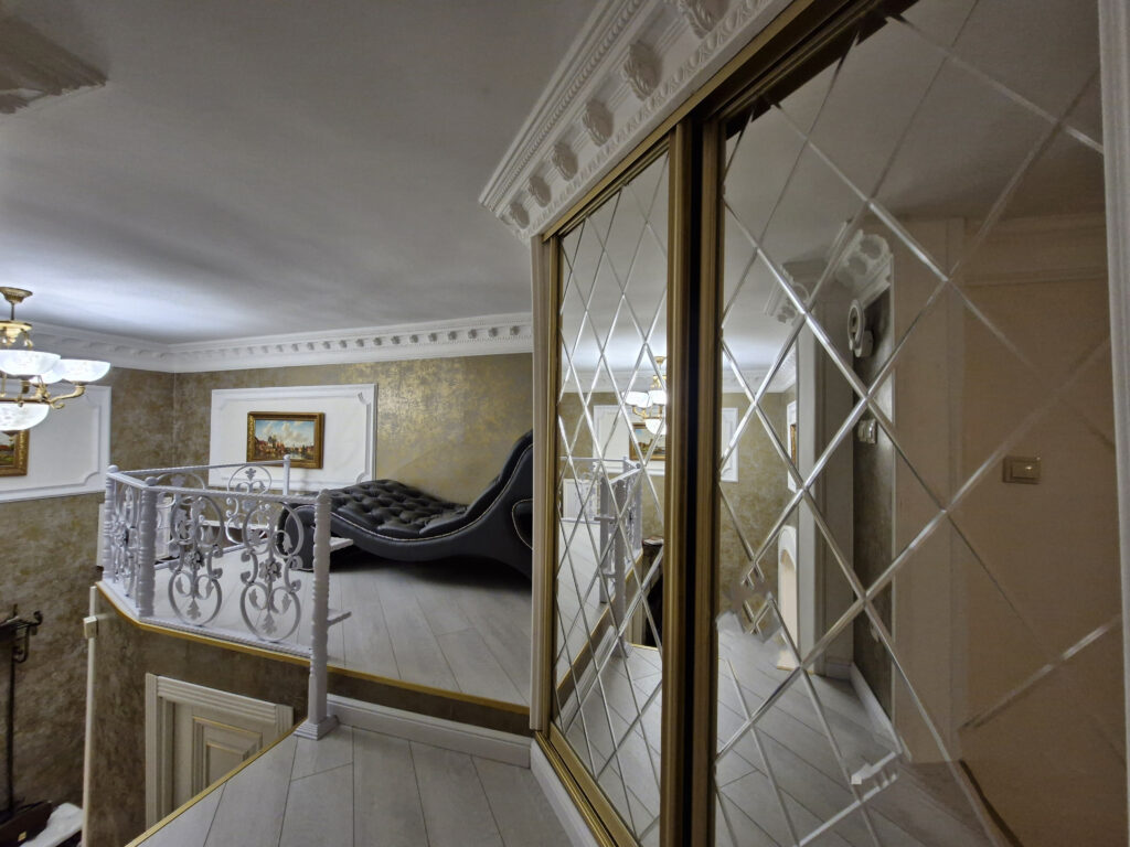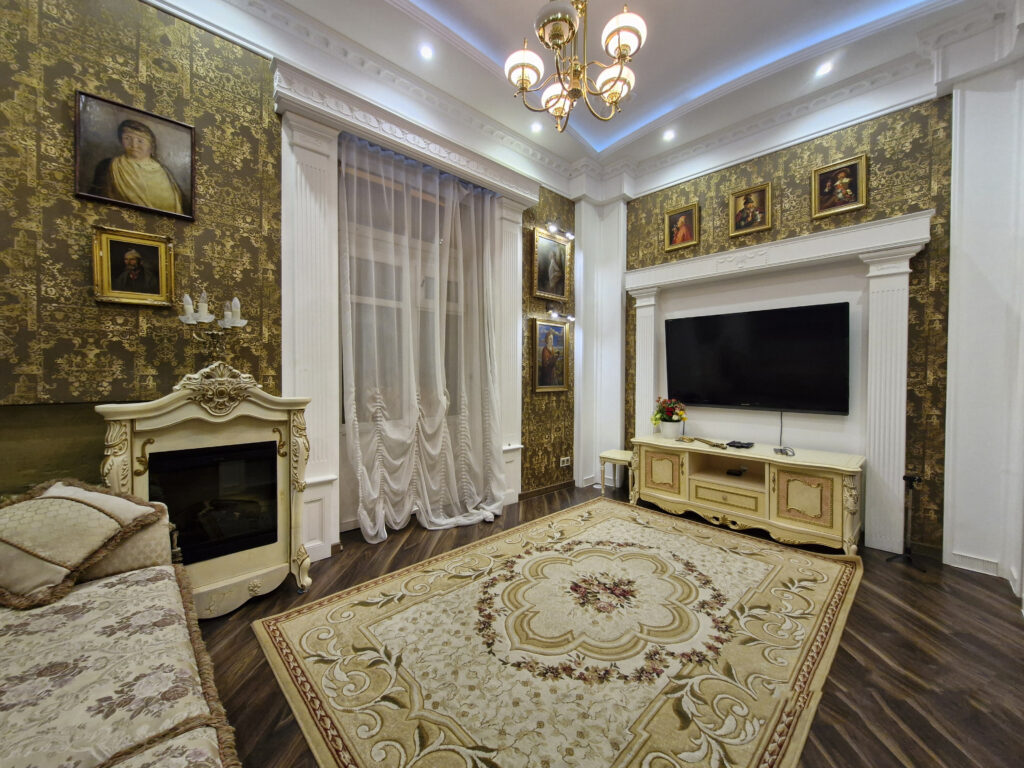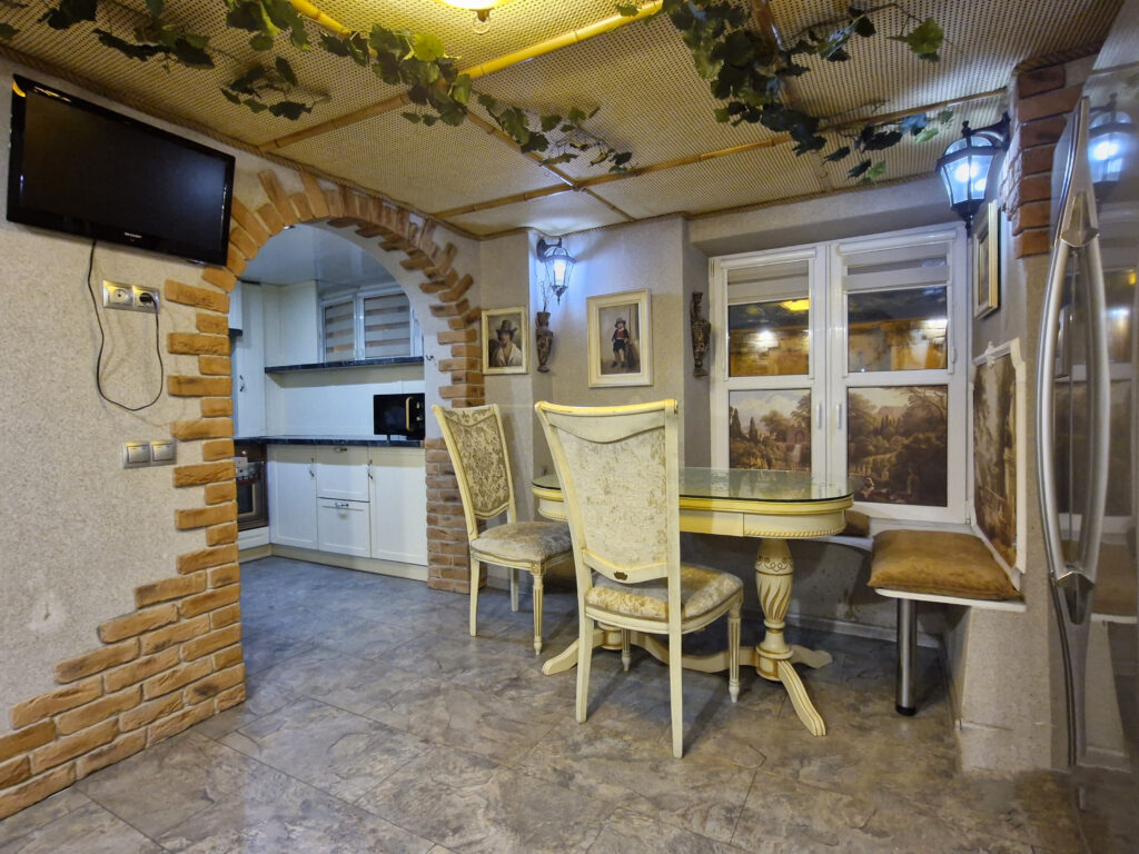 Внутри квартира обставлена очень дорого: мебель с имитацией старины, много позолоченных элементов, плитка с античным рисунком, много картин. Нижний этаж разделен на гостиную, кухню и небольшую столовую зону. На верхнем этаже расположены спальня и небольшой уголок для отдыха под потолком.