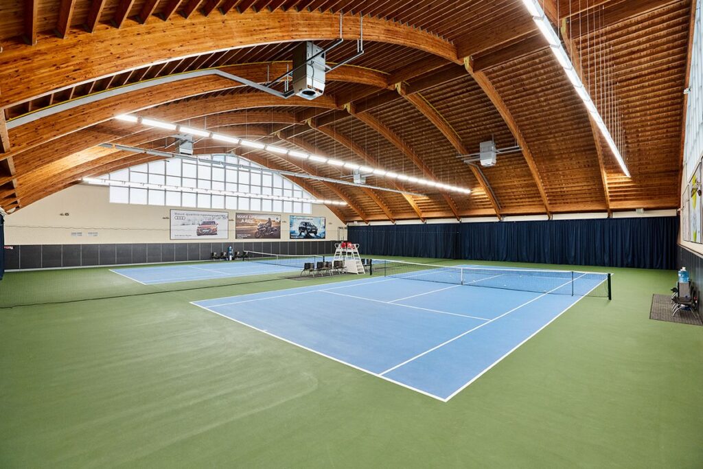 Особое внимание в комплексе уделено комфорту игроков. Зал крытых кортов выполнен с арочным деревянным сводом, который: